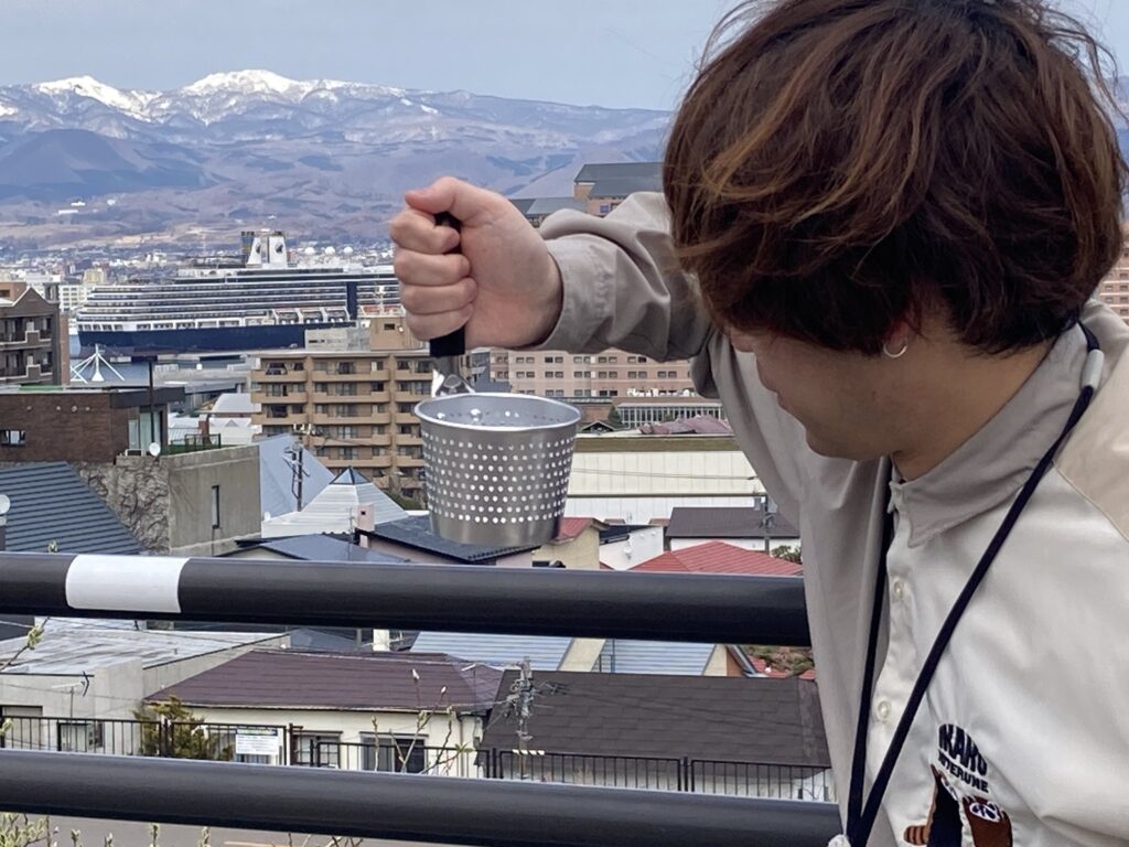 今週の湯切り。クルーズ船をバックに。今年度はかなりクルーズ船が寄港するらしいですね。
