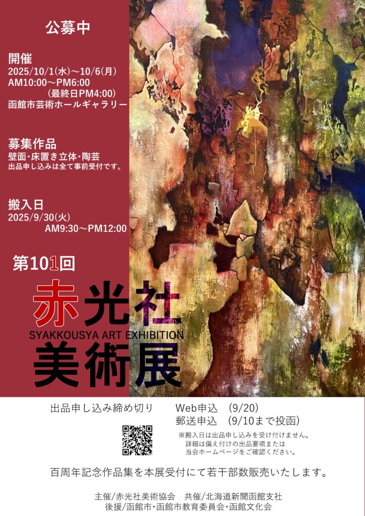 昨年第100回の美術展が北海道立函館美術館で開催された赤光社美術協会。今年10月開催の101回目の美術展の公募が始まっています。公募の種別ではこれまであった絵画、版画、彫刻、陶芸というジャンル分けが変わります。