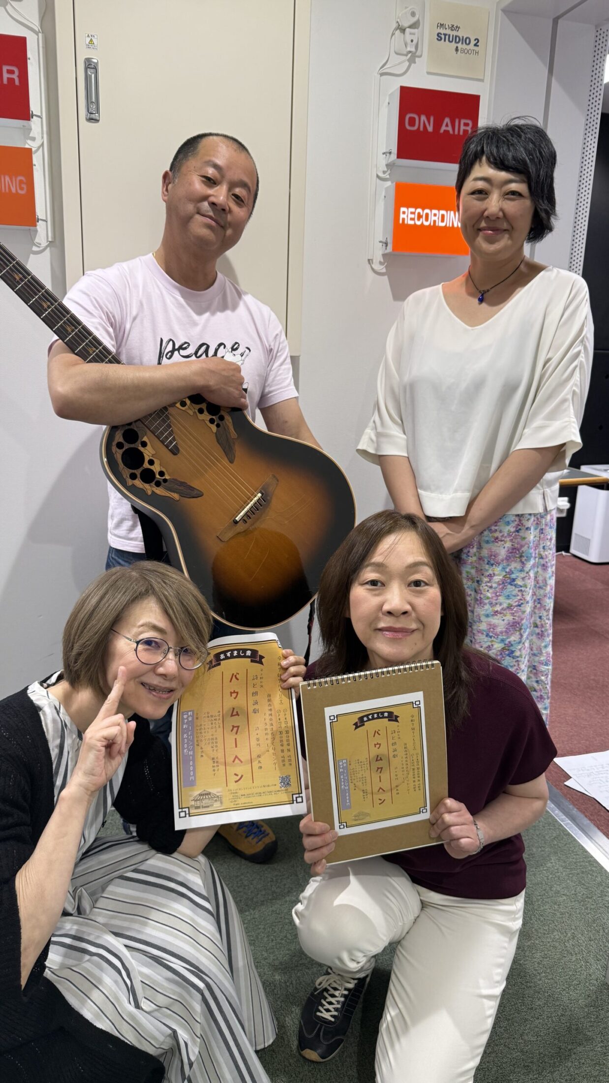 | 11:10 | 人ネットワーク(月・水) ご出演:あずまし舎(や) 世話人 山崎 もも子 さん、藤澤 知華子 さん 写真は音楽収録に駆けつけて下さった、音楽ユニット「カポ」のお二人と。