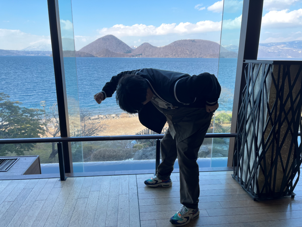 今週の湯切り。洞爺湖をバックに。きれいだわぁ。ジェイソンvsフレディの冒頭のシーン思い出す